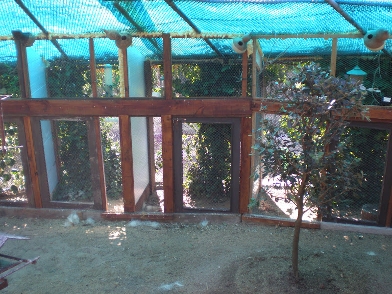 Vista lateral de 2 viveiros exteriores (lado esquerdo viveiro dos Diamantes Papagaio e lá dentro viveiros individuais para criação de Cubanitos, do lado direito temos o viveiro dos Diamantes Mandarim |